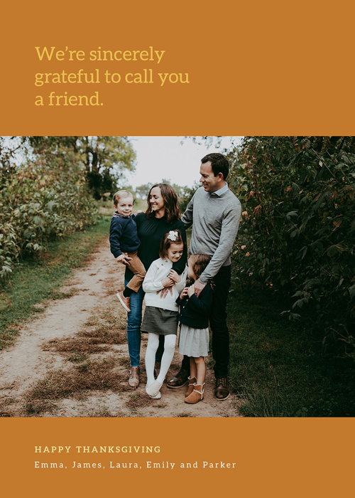 Add your photos and personalized details to make a Thanksgiving Photo Card that’s truly your own with easy-to-use design tools.