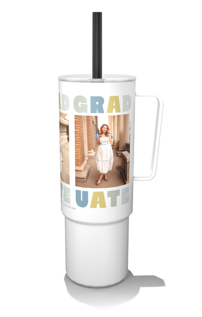 Create a customized 32oz MiiR photo tumbler with a built-in handle and flexible silicone straw for easy, on-the-go hydration.
