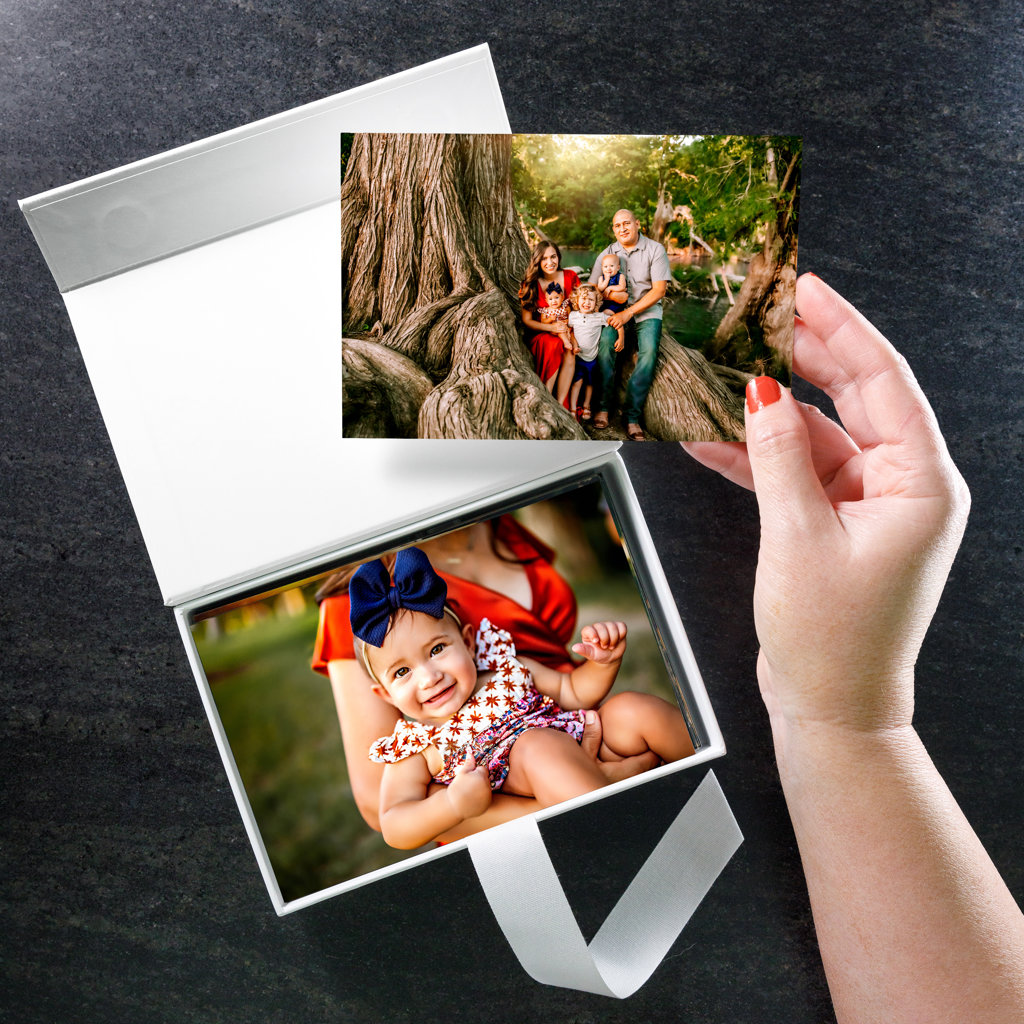 A Soft Magnetic Closure keeps your prints secure with an internal ribbon for easy access. Each box is 1.5" deep and holds up to 125 4x6" prints depending on your choice of paper.