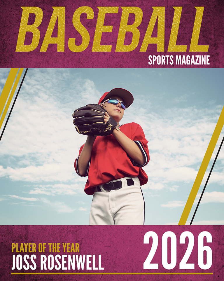 Each Magazine Cover is a one-sided personalized 8x10 print that features a magazine-style design with bold headlines, player photo, name, team, and season details.