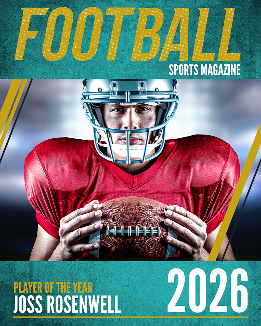 Each Magazine Cover is a one-sided personalized 8x10 print that features a magazine-style design with bold headlines, player photo, name, team, and season details.Size