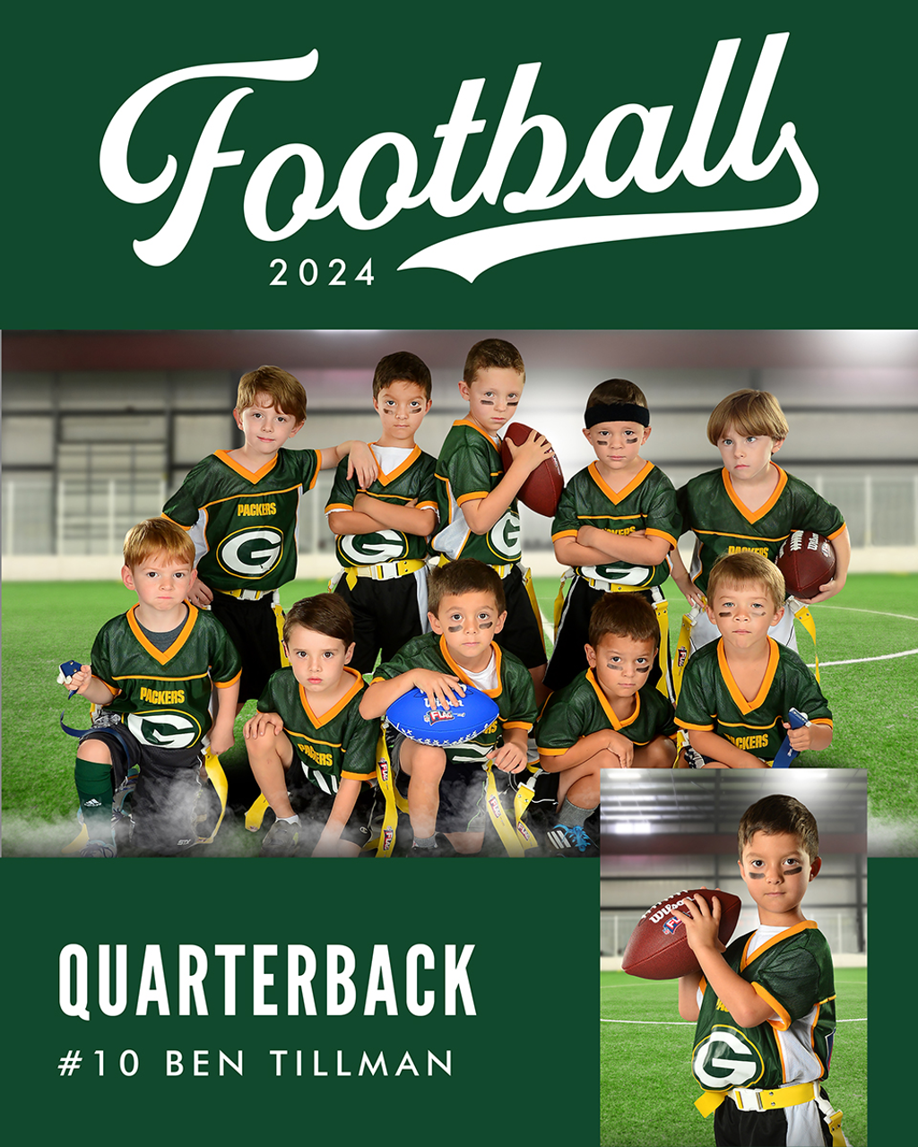 Each Memory Mate is a one-sided 8x10 print that features a stylish sports-themed design with space for player name, school, jersey number, and other details.