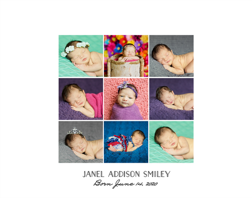 Make a tasteful Photo Collage for your walls with your treasured snapshots and personalize with details like your name, date and more.