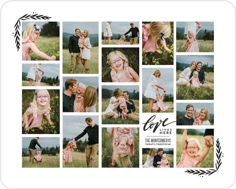 Make a tasteful Photo Collage for your walls with your treasured snapshots and personalize with details like your name, date and more.